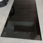 A microwave, an electric kettle, and a refrigerator are also featured at a fully furnished kitchen.